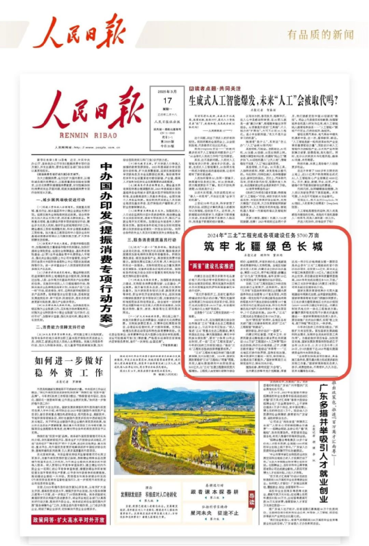 在内蒙古赤峰市克什克腾旗,浑善达克—科尔沁沙地南缘治理一期项目是央企参与“三北”工程建设的首个防沙治沙项目,总投资3.4亿元,其中央企中国三峡集团投资1.3亿元。“通过发挥央企优势,项目建设效率和质量明显提高,2024年共完成治理任务9.31万亩。”三峡三北防护林建设(内蒙古)有限公司常务副总经理李杨介绍。