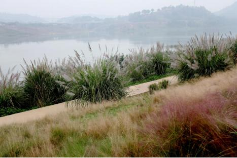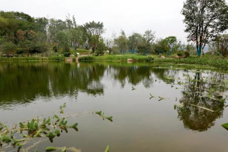 鸳鸯湖水从山上潺潺而来,溪流沿岸种植了适合本地生长的如芦苇等水生植物,溪水在流动的过程中,被水生植物自然过滤净化流入湖中。湖岸种植有多种水生植物,湖中投放有水生生物。水生生物和水生植物共同对湖水再次净化,达到水绿湖清的效果。