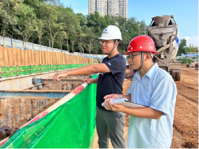 在江西九江,两湖(南门湖、甘棠湖)综合治理项目现场,项目经理王寒冬正与施工单位网格员检查湖边箱涵重建工作。