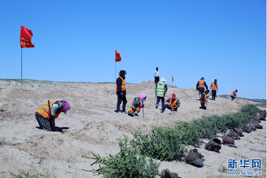 5月15日,工人在克什克腾旗境内的浑善达克沙地南缘扎沙障、种苗木。新华网石毅 摄
