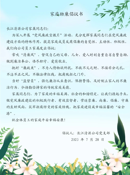 ty8天游平台登录清源公司党支部开展家庭助廉活动,向员工家属发送《家庭助廉倡议书》,呼吁广大员工家属发挥在党风廉政建设方面的特殊作用,常吹“清廉风”、把好“廉政关”、当好“监督员”,筑牢拒腐防变的家庭防线;送上一封廉洁家书,搭建起公司与家属沟通的桥梁,其中有女儿对父亲的孺慕之情,有父亲对孩子的殷殷期望,有长姐对妹妹的谆谆嘱托,纸短情长、廉润万家,家庭助廉活动凝聚起廉洁齐家的强大合力,推动崇德尚廉蔚然成风。