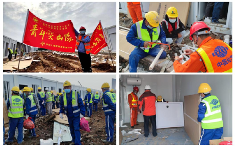4月16日凌晨6点,安徽区域公司仅用7个小时就完成资源调配,迅速集结安能二局、中化十四建、中铁五局、中交上航局4家联合体单位400余名符合当前防疫要求的专业技术人员,第一时间组建支援队、青年突击队和工人突击队,紧急奔赴现场,迅速开展实地勘测,有序实施“健康驿站”隔离点的建设任务。