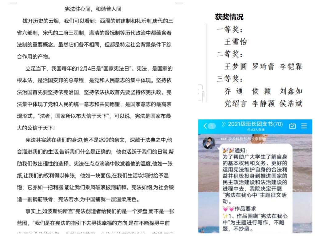 此次宪法征文比赛营造了学院学生学法、知法、守法、执法、护法的良好氛围,对青年学生树立宪法意识、公民意识、爱国意识、民主法治意识方面起重要作用。