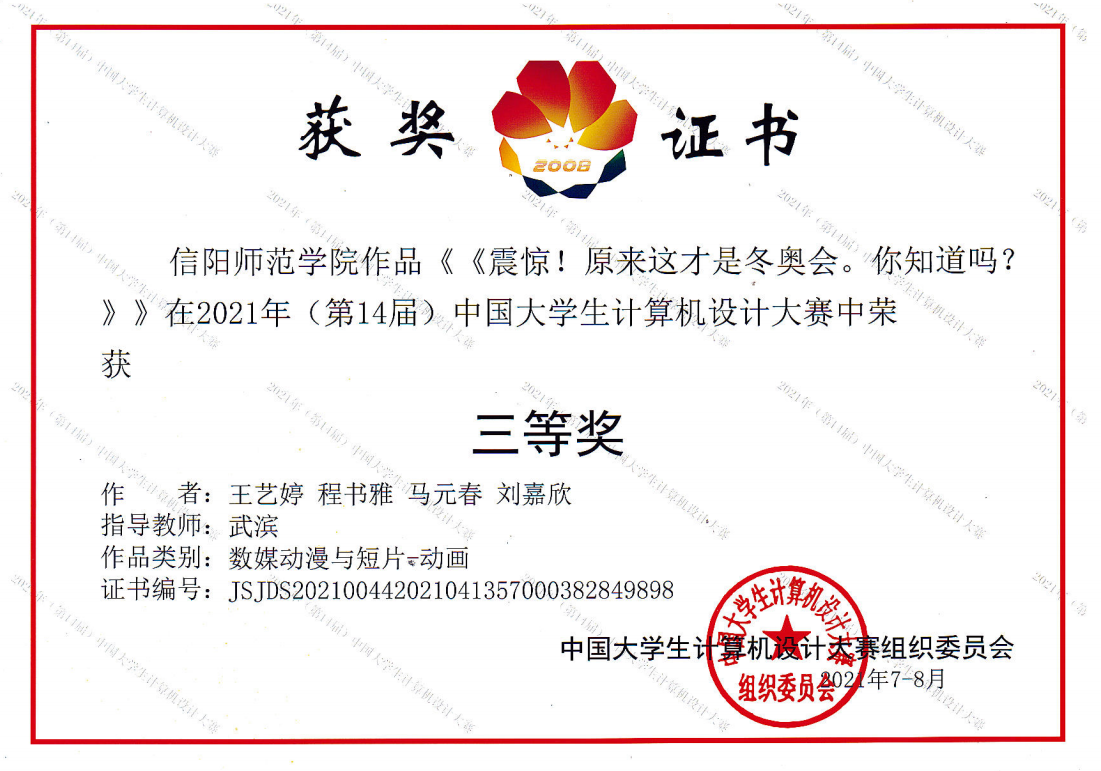 时间:2021-10-05 18:20:28 来源: 作者: 阅读: 次近日,由国家教育部主办的2021年第十四届中国大学生计算机设计大赛落下帷幕,在厦门决赛赛区数媒动漫与短片普通组比赛中,我院两组作品经过河南省大赛推选,与全国上百所高校参赛作品进行角逐,最终脱颖而出,均荣获国家级三等奖。获奖作品是由我院教育技术系老师武滨指导,王艺婷、马元春、刘嘉欣和程书雅完成的动画作品《震惊!原来这才是冬奥会。你知道吗?》,刘萱、刘琦老师指导,郭嘉、张欣欣、代昭、余金阳和马倩完成的动画作品《速滑小讲堂》。