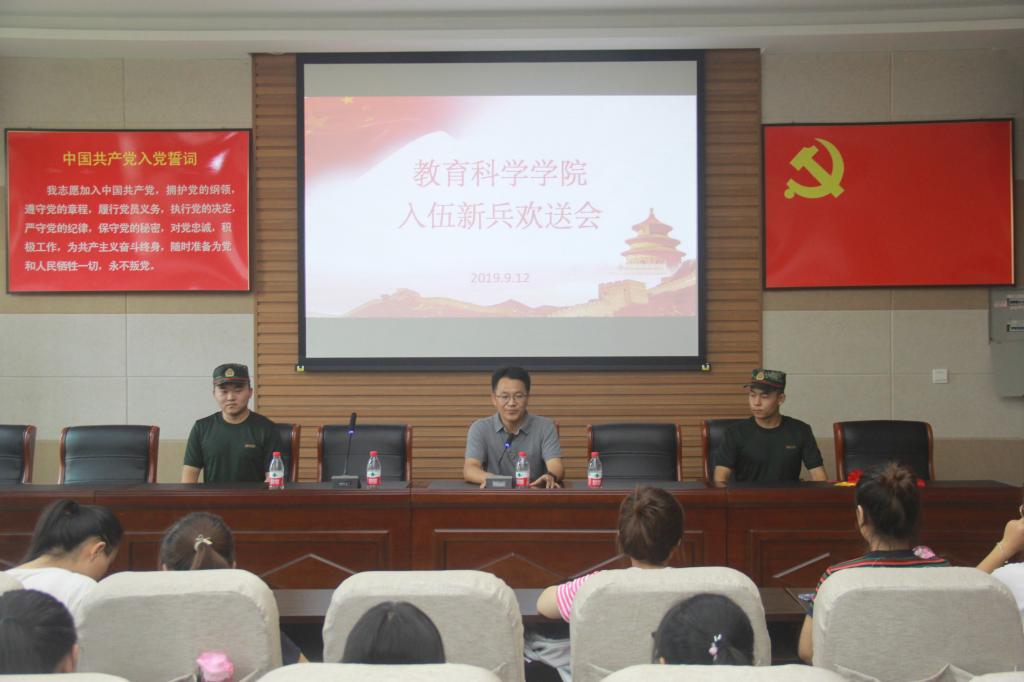时间:2019-09-13 20:45:41 来源: 作者: 阅读: 次9月12日,教育科学学院在教科楼301会议室召开新兵入伍欢送会,院党委副书记李贵杰,班主任朱方,任课老师朱欲晓,2018级心理学班、学前教育一班同学参加了欢送会。