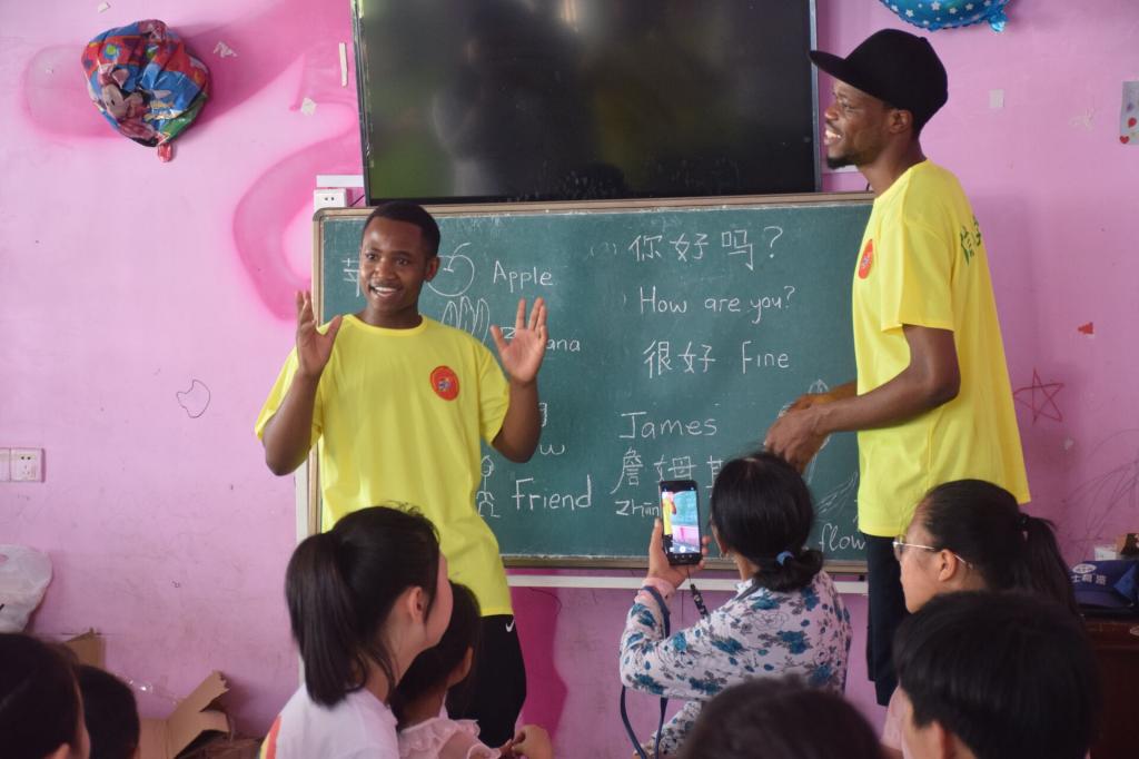 在趣味英语课堂上,“三下乡”社会实践团队中的五位留学生依次用中文向孩子们进行了独特的自我介绍,受到了孩子们的热烈欢迎。随后,留学生和孩子们一同完成了"苹果、香蕉、狗、朋友"等简单单词及英文句型的学习,开展了儿童自我介绍等对话教学活动,让孩子们借助情景学习,并通过猜单词等游戏活动加深孩子们的记忆。留学生们新奇幽默的英语教学方式激发了孩子们学习英语的积极性。在孩子们的积极配合下,本次趣味英语课堂活动顺利结束。