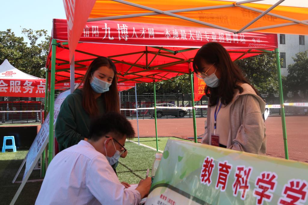 时间:2020-11-11 10:41:19 来源:李非凡 作者:张小娅 陈雪荣 赵甜甜 阅读: 次11月7日,由河南省教育厅主办,信阳师范学院承办的“河南省毕业生就业市场豫南分市场暨信阳师范学院2021届毕业生线下冬季双选会”在我校西操场举行。教育科学学院团委老师田园亲临现场指导招聘中的各项事宜,积极组织学生参与此次招聘会。