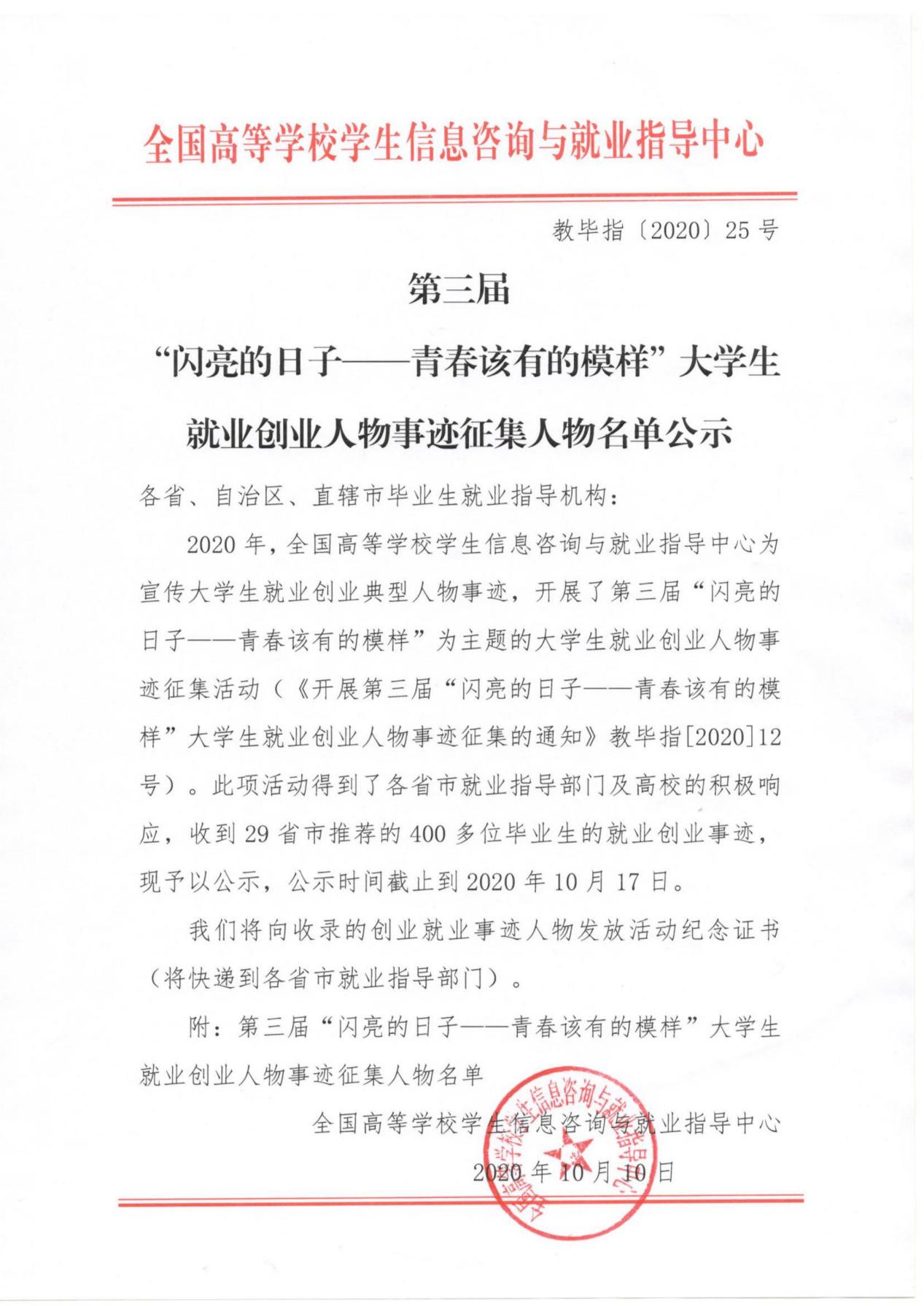 为响应习近平总书记和李克强总理鼓励大学生基层就业和创新创业的号召,加强高校毕业生就业创业宣传,教育部全国高等学校学生信息咨询与就业指导中心主办“闪亮的日子——青春该有的模样”大学生就业创业人物事迹征集活动,旨在加强高校毕业生就业创业宣传,树立就业创业典型,展示大学生就业创业的丰硕成果和精神风貌,号召青年学生扎根祖国大地,在创新创业中增长才干、锤炼意志,在实现伟大中国梦的实践中实现青春梦想。本次评选活动从6月份开始,经过学校评选报送、省教育厅评审、教育部终审评选三个阶段,最终选出全国先进典型。