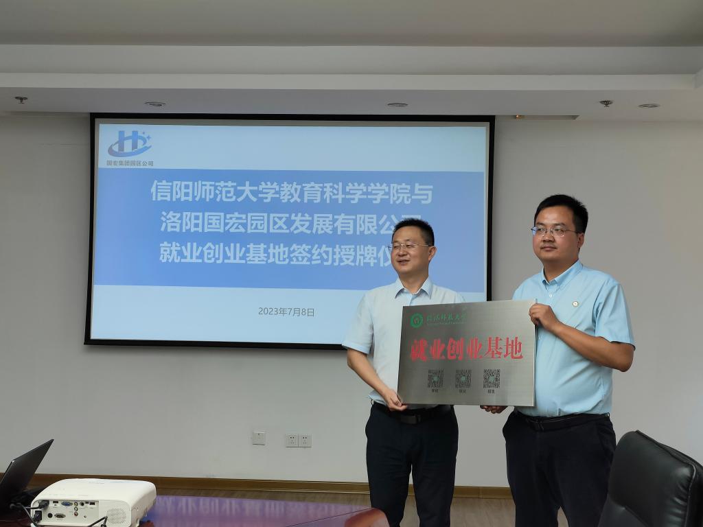 董银银一行来到洛阳市涧西区教育体育局、洛阳国宏园区发展有限公司进行访谈调研。单位负责人介绍了各自的建设发展情况以及人才需求情况。董银银对教育科学学院的基本情况、师资力量、学科专业建设以及2023届毕业生情况等作了详细介绍。座谈会上,校企双方围绕协同育人、开拓就业岗位、创新实践等方面进行深入交流。活动最后,教育科学学院党委副书记董银银代表学院与洛阳市涧西区教育体育局、洛阳国宏园区发展有限公司分别签订校企合作协议并授予“信阳师范大学就业创业基地”牌匾。