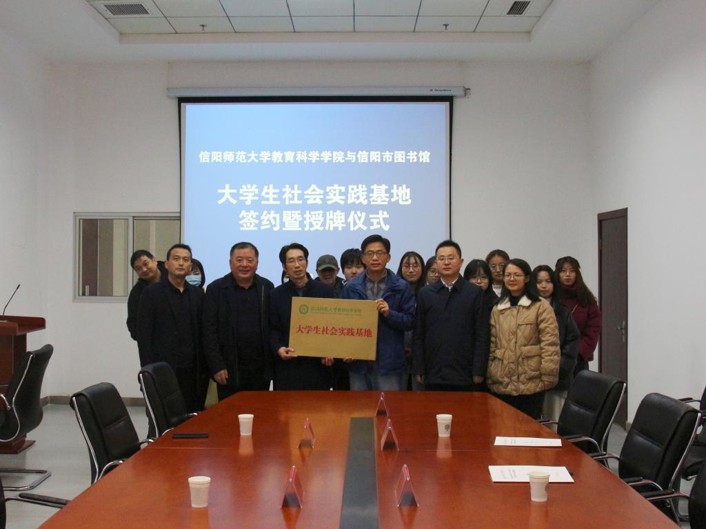 教育科学学院与信阳市图书馆联合举行共建大学生社会实践基地签约暨授牌仪式时间:2023-11-29 18:47:28 来源: 作者: 阅读: 次11月29日,教育科学学院在信阳市图书馆举行共建大学生社会实践基地签约暨授牌仪式。信阳市文旅局副局长胡宝强,公共文化科科长刘义俊,市图书馆馆长朱进;教育科学学院党委书记房加帅,副书记董银银,青苗志愿服务队师生代表及市图书馆工作人员参加仪式并进行座谈。  房加帅致辞,对市图书馆为学生提供学习和实践平台表示感谢,简要介绍了学校和学院基本情况,要求同学们以该实践项目为契机,担当时代使命,赋能地方发展。朱进介绍了市图书馆的相关情况,期望双方在社会公共服务、人才培养、课题研究等方面开展多层次、跨领域合作交流。学生代表、图书馆工作人员作交流发言。胡宝强指出,此次共建实践基地,是双方加强高校人才培养与社会需求的有效对接,希望双方加大优势互补,进一步深化合作,打造系列文化品牌项目,共同推动我市文化事业发展,为社会培养更多高素质、高层次的人才。 双方负责人就合作共建大学生社会实践基地进行签约并授牌。 仪式结束后,与会人员参观了信阳市图书馆。