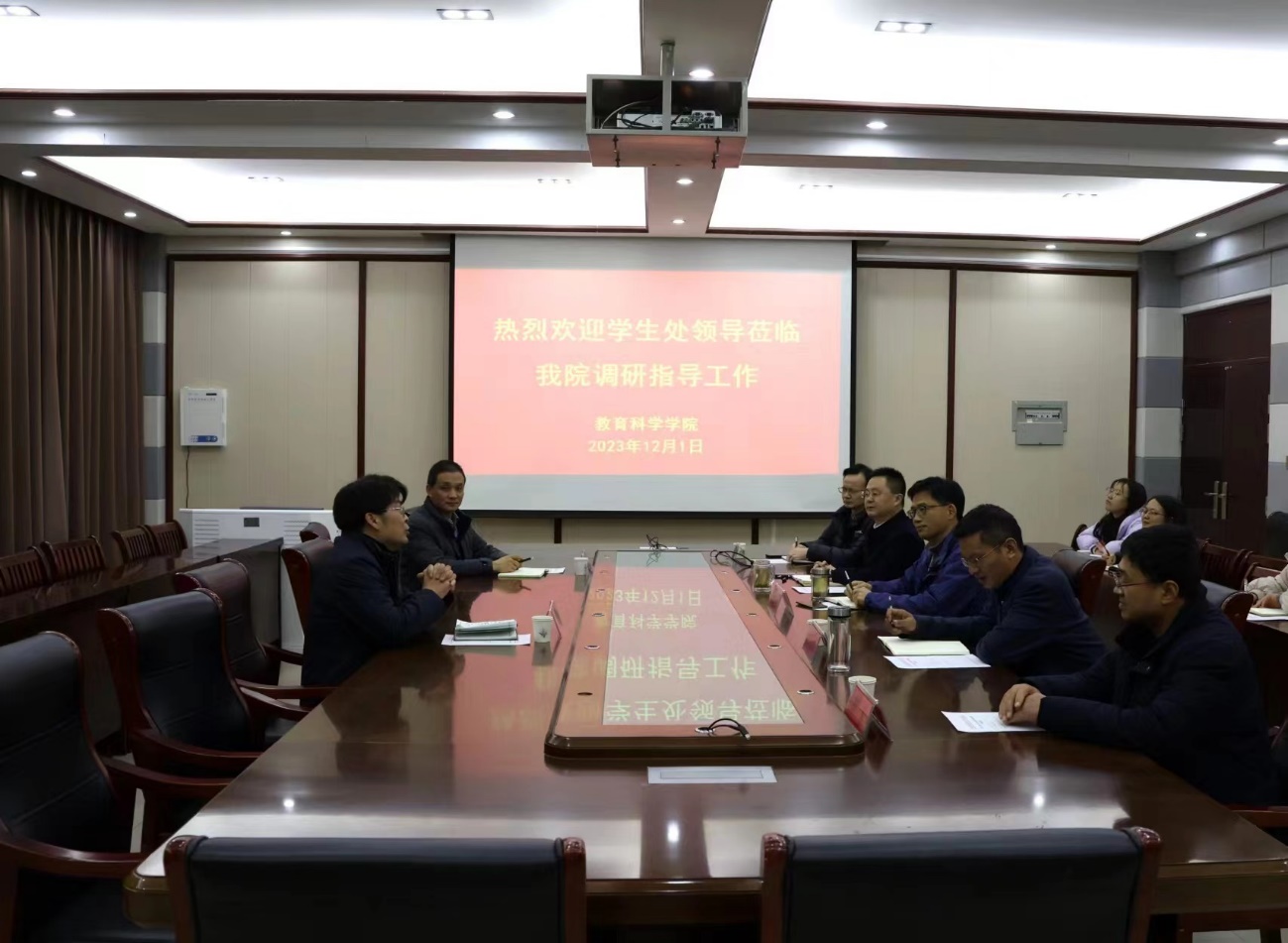 学生处领导到教育科学学院调研指导工作时间:2023-12-03 19:39:03 来源:教科院新闻宣传中心 作者:吴宇熙 崔佳怡 阅读: 次12月1日,学生处处长朱四倍、副处长王忠磊到我院进行调研指导。教育科学学院党委书记房加帅,院长何安明,党委副书记董银银,副院长郭勇、孙天义以及全体专职辅导员参加会议。会议于教科楼402会议室召开,由房加帅主持。  会议伊始,房加帅对学生处一行表示热烈欢迎,并衷心地感谢各位领导长期以来对教科院学生工作的关心和支持。随后,朱四倍对我院辅导员队伍组成进行详细了解,同时强调辅导员应切实关注学生身心健康,把学生的安全工作落到实处,及时走访宿舍,了解学生是否安全用电,消除安全隐患,并对辅导员职业能力大赛、考研送温暖等相关工作进行部署安排。王忠磊指出学院应充分发挥学生干部、寝室长的作用,对寝室人际矛盾、违规用电等问题进行整改处理,同时要加强对家庭困难同学的关心和帮扶,及时关注他们的心理健康。会议最后,何安明提出辅导员应提高认识,加强创新能力,将学生工作做细做实,真正成为学生的知心朋友和人生导师。 通过此次调研,不仅增进了学生处与我院之间的交流联系,同时也促进了我院辅导员队伍的建设,对推动我院学生工作的进一步发展具有重要意义。 编辑:吴宇熙 崔佳怡 审核:杨艺卓 摄影:雷思雨