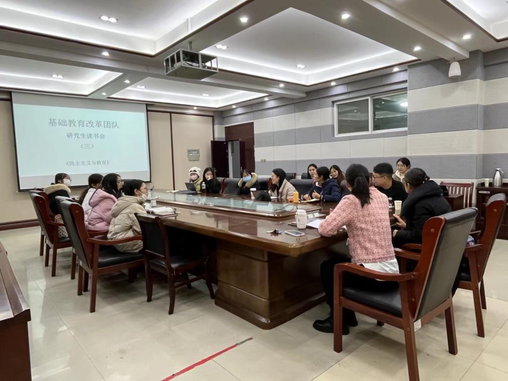 “基础教育改革与发展团队”读书会活动如期举行时间:2023-12-27 10:00:26 来源: 作者: 阅读: 次12月26日下午,我院“基础教育改革与发展团队”读书会活动如期在教科楼402教室举行。周娜、邢思珍、骆丽娟、李辉辉、李泽娟等老师及2023级教育学和学前教育学专业研究生参加。  本次读书会阅读书目是《民主主义与教育》。 读书会开始,周娜老师提出两个问题:如何描述杜威提出的“民主社会”及如何理解“学校即社会”这句话。围绕上述问题,老师与学生们提出自己的观点,并引发对方法与方法论、学校与社会、儿童成长是否需要纯善环境、数字环境与教育变革等问题的深入探讨。酣畅淋漓的共读交流启发了师生对学校本质、社会变革与教育演变、技术进步与教育变革等议题的关注及思考。