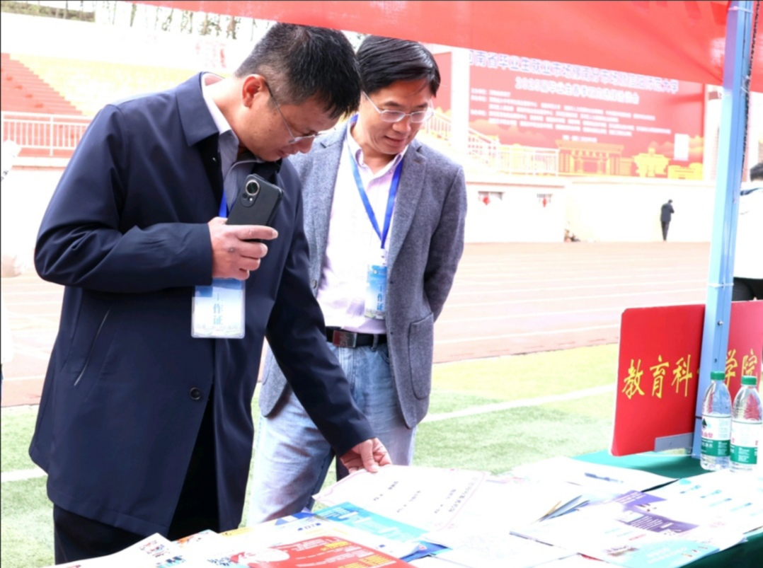 时间:2025-03-30 19:58:55 来源:教科院新闻宣传中心 作者:吴皓 杨泽钰 阅读: 次为深入贯彻中央和地方关于促进高校毕业生就业的方针政策,切实做好2025届毕业生就业服务工作,搭建起毕业生与用人单位精准对接的桥梁。3月29日,河南省毕业生就业市场豫南分市场暨信阳师范大学2025届毕业生春季双向选择洽谈会在我校西田径场成功举办。教育科学学院高度重视此次双选会,积极组织学院2025届毕业生参加,院党委书记房加帅、院长何安明、党委副书记缑星、专职辅导员提尼格尔以及毕业班班主任前往双选会现场指导。