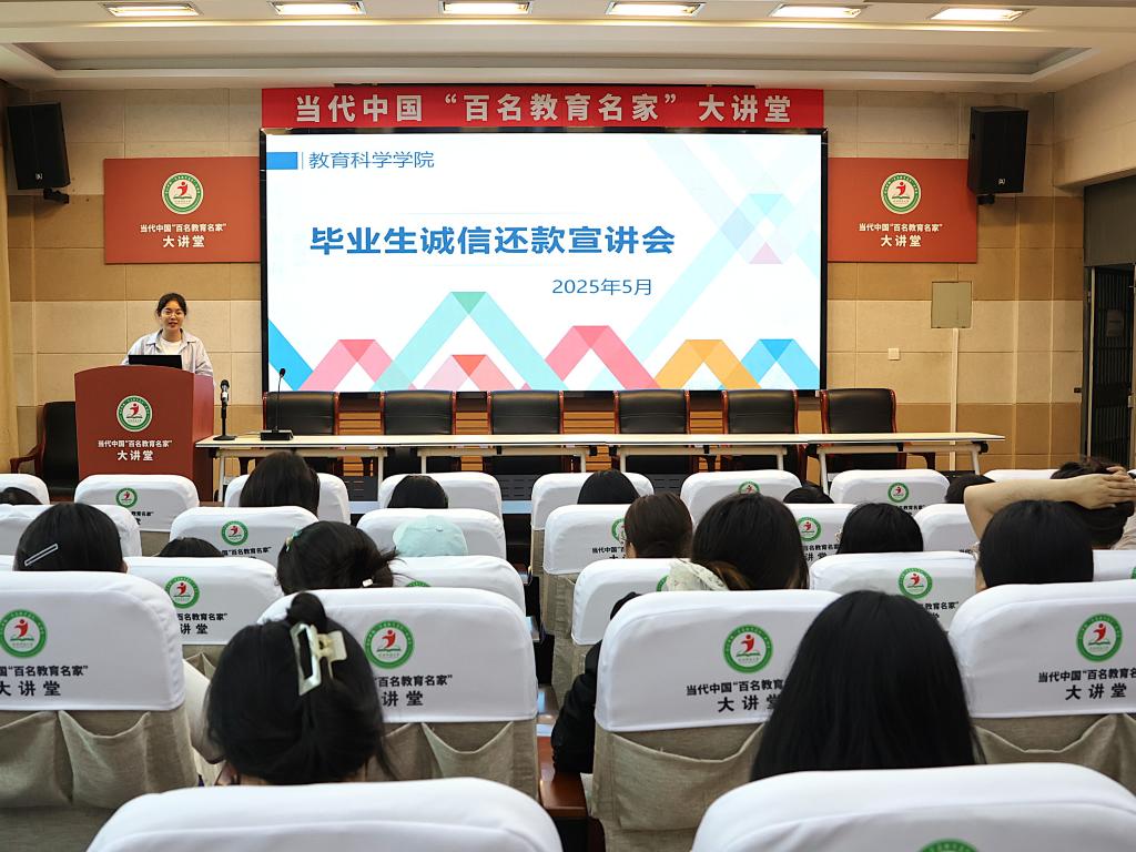 时间:2025-05-14 21:42:28 来源:教科院新闻宣传中心 作者:祐亚菊 蒋璐瑶 阅读: 次为强化毕业生诚信意识,规范国家助学贷款还款流程,5月14日下午,教育科学学院于教科楼301举办2025届毕业生诚信还款专题宣讲会。本次活动由专职辅导员刘然然主讲,贷款毕业生参与学习,共筑诚信还款防线。