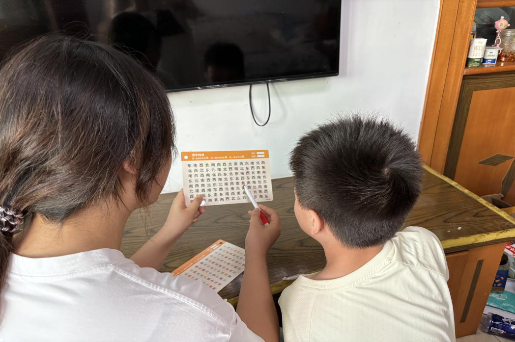 另一边的“拼音寻宝大作战” 更显热闹。实践团成员提前把写有拼音和词语的卡片藏在教室的书架、窗台、桌椅角落,孩子们分成 3 组,拿着 “寻宝地图” 分头寻找。“我找到啦!” 扎马尾的小女孩举着一张写有 “白云” 的卡片跑回来,说这个 “云(yín)”应该是 “yún”,兴奋地把卡片贴在小组的 “成果墙” 上,没有生硬的教学,只有在挑战成功后的自豪与表达欲,普通话就这样自然而然地融入孩子们的分享里。