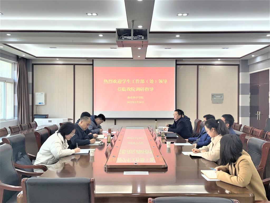 时间:2022-02-26 19:43:09 来源:教科院新闻部 作者:马玉娇 周媛媛 曹童然 亓亚兴 阅读: 次2月26日,信阳师范学院学生工作部(处)长王建旭,副部(处)长雷梁,学生教育科科长孙绪曙到我院开展调研指导工作。教育科学学院党委书记房加帅,院长何安明,党委副书记董银银,副院长郭勇、孙天义以及全体专职辅导员参加会议。会议于教科楼402会议室召开,由房加帅主持。