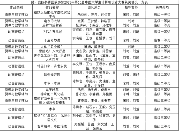 教育技术系学子在第16届中国大学生计算机设计大赛河南省级赛中获奖时间:2023-05-23 13:41:31 来源: 作者: 阅读: 次5月21日,第16届中国大学生计算机设计大赛河南省级赛落幕。经过层层选拔后,在河南省各大高校共911项作品中,评出一等奖130余项,二等奖190余项,三等奖300余项。我院教育技术学系选送的17件作品全部获奖,其中一等奖5项,二等奖6项,三等奖6项。本次比赛采用线上答辩的形式进行。   中国大学生计算机设计大赛是由教育部高等学校计算机类专业教学指导委员会、教育部高等学校软件工程专业教学指导委员会、教育部高等学校大学计算机课程教学指导委员会、教育部高等学校文科计算机基础教学指导分委员会、中国教育电视台联合主办。旨在提高大学生综合素质,进一步推动高校本科面向21世纪的计算机教学的知识体系、课程体系、教学内容和教学方法的改革,培养德智体美全面发展、具有运用信息技术解决实际问题的综合实践能力、创新创业能力,以及团队合作意识的人才。 第16届中国大学生计算机设计大赛采用校级初赛、省级复赛、国家级赛三级赛制。国赛将在7月至8月举行。参赛对象为中国境内高校2023年在籍的所有本科生。国赛只接受省级赛上推荐的本科生参赛作品。我校共上推5项作品参加国赛,其中4项为我院获得一等奖作品《千金奇妙游》《华佗之五禽戏》《铝热反应的化学虚拟实验平台》和《电表的改装》。 本届大赛启动以来,我院领导积极组织专业指导老师团队,提供良好的备赛环境,指导教师认真指导学生修改、完善作品,参赛队员团结协作、勇于创新,最终顺利完成了作品的制作和答辩。此次比赛在各方的不懈努力之下,取得了优异的成绩,相信在即将到来的国赛当中,我院学子将在各位领导和老师的带领下取得更加优异的成绩。