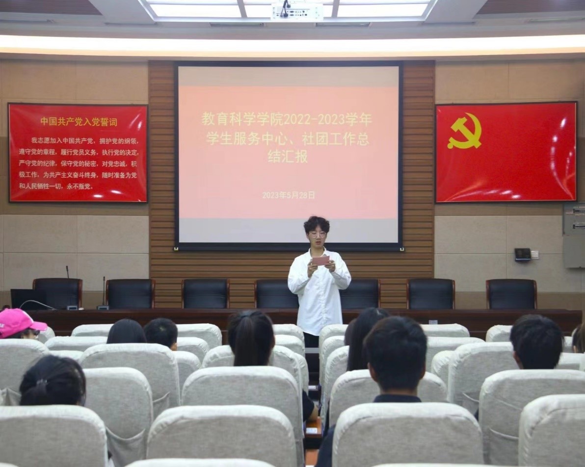 教育科学学院召开2022-2023学年学生工作中心、社团工作汇报会议时间:2023-05-28 19:28:52 来源:教科院新闻宣传中心 作者:曹童然 吴宇熙 阅读: 次5月28日,教育科学学院2022-2023学年学生工作中心、社团工作总结汇报会议在教科楼301会议室召开。分团委书记牛洁楠,专职辅导员杨艺卓、提尼格尔,主席团成员,学生工作中心、团委、学生会各部门部长及干事,社团各社长、团支书等参加此次会议。会议由综合联络部干事和益倍主持。  会议伊始,各社团负责人依次对本学年工作进行汇报,详细介绍部门的工作成果,并针对工作问题进行自我反思,提出改进方案。会议上,童真话剧社表示要积极开展活动,提高部门成员的积极性;心悦社提出要提高活动质量,增强活动创新性;教育科学协会表示要提高工作效率,增强成员参与度;大学生摄影爱好者协会表示要提高活动精品度,吸引更多学生参与活动;新闻宣传中心指出要提高工作积极性,更好地传播学院文化,打造学院特色等。各部门的工作成绩喜人,这份辉煌与成就是所有成员心血和智慧的结晶,同时也凝聚着学院各级领导、老师们对各部门的关心和支持。  本次会议的召开总结了教育科学学院各部门的工作,找出了其存在的问题并提出了解决方法,为后期学生工作的开展奠定了良好的基础。 编辑:曹童然 吴宇熙审核:杨艺卓 摄影:李亦萌
