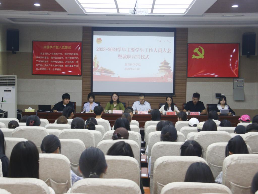 教育科学学院召开2023-2024学年主要学生工作人员大会暨就职宣誓仪式时间:2023-06-03 19:02:25 来源:教科院新闻宣传中心 作者:刘至涵 荆媛媛 阅读: 次6月3日,教育科学学院于教科楼301会议室召开2023-2024学年主要学生工作人员大会暨就职宣誓仪式,院党委副书记董银银、分团委书记牛洁楠,专职辅导员杨艺卓、提尼格尔,学生会、学生服务中心、团委及社团主要学生干部参加本次会议。会议由牛洁楠主持。  会议在庄严的国歌中拉开序幕,杨艺卓宣读《教育科学学院2023-2024学年学生干部名单》,随后,新一届学生会执行主席李玮莹发言,分享学生会工作心得、工作思路;团委副书记刘小冉强调要提高服务意识,加强思想文化建设;社团联合主席马韬雯表示要提高各社团之间的凝聚力,积极沟通交流。 牛洁楠指出学生干部在工作中存在的问题,并提出三点要求:一、学生干部要有情怀,要坚定爱国信念,提高政治思想觉悟。二、学生干部要有学识,恪守学生本分。三、学生干部要敢担当,肯奋斗。接着,杨艺卓、提尼格尔依次发言,结合自身经历向同学们分享工作经验。最后,董银银总结本次会议。他强调学生干部要有大局意识,强化责任意识;要有竞争意识、危机意识,做好“六个带头”,用实际行动为同学们起到模范带头作用。 本次会议的顺利召开明确了学生干部的工作职责,对学生工作队伍统一思想、凝聚力量、激发动力有重要作用,有助于推动我院学生工作进入新高度。 编辑:刘至涵 荆媛媛 审核:杨艺卓 摄影:张梦灵