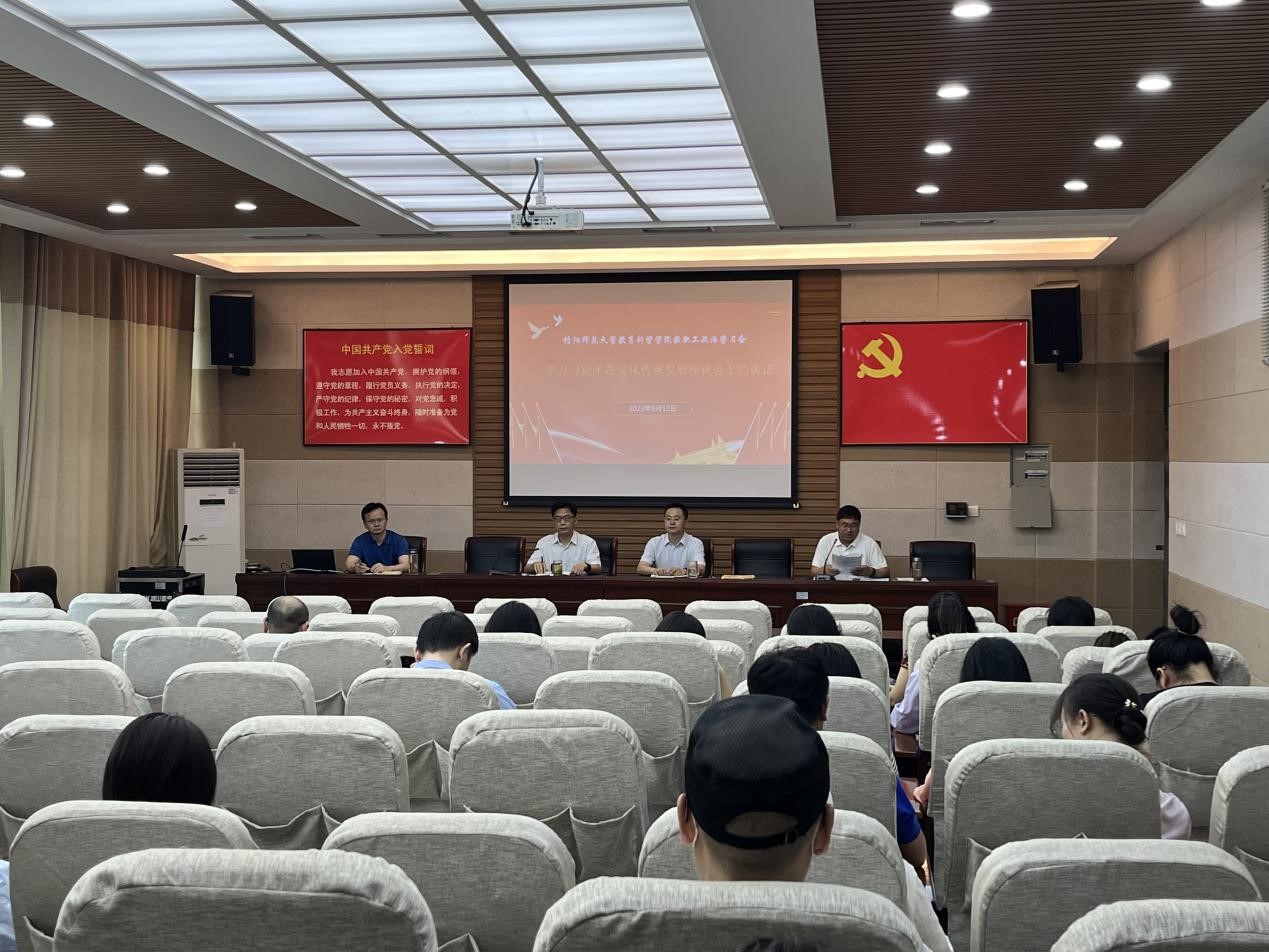 教育科学学院召开学习习近平总书记在文化传承发展座谈会上的讲话精神政治学习会时间:2023-06-14 22:39:11 来源:教科院新闻宣传中心 作者:曹童然 荆媛媛 阅读: 次6月13日,教育科学学院在教科楼301会议室召开学习习近平总书记在文化传承发展座谈会上的讲话精神政治学习会。教育科学学院党委书记房加帅及全体教职工参加本次会议。  会议伊始,房加帅带领全体教职工学习习近平总书记在文化传承发展座谈会上的重要讲话精神。会议指出,习近平总书记在文化传承发展座谈会上的重要讲话,对中华文化传承发展的一系列重大理论和实践问题作了全面系统深入阐述,立意高远、思想深邃、内涵丰富,是一篇闪耀着马克思主义思想光芒的纲领性文献。 房加帅强调,要深入贯彻落实习近平总书记重要讲话精神,深刻领悟“两个确立”的决定性意义,增强“四个意识”、坚定“四个自信”、做到“两个维护”,要把思想和行动统一到习近平总书记重要讲话精神上来;要深刻把握中华文明的突出特性,要进一步增强使命感、责任感和紧迫感,把学习贯彻习近平总书记重要讲话精神作为主题教育的重要任务,同学习贯彻习近平新时代中国特色社会主义思想结合起来,走好优秀传统文化创造性转化、创新性发展的道路。 本次会议的顺利召开,有助于全体教职工进一步领会和把握习近平总书记重要讲话精神,为推进文化理论创新指明方向,为建设高水平师范大学、实现高质量发展夯实文化底蕴。 编辑:曹童然 荆媛媛 审核:杨艺卓