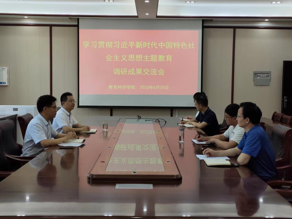 教育科学学院开展学习贯彻习近平新时代中国特色社会主义思想主题教育调研成果交流会时间:2023-06-24 10:53:31 来源:教科院新闻宣传中心 作者:刘至涵 罗梦瑶 阅读: 次6月20日,教育科学学院于教科楼402会议室开展学习贯彻习近平新时代中国特色社会主义思想主题教育调研成果交流会,院党委书记房加帅,院党委副书记董银银,副院长郭勇、孙天义参加本次会议。会议由房加帅主持。  会议伊始,房加帅指出,学院应当加强基层党建,促进事业发展,学习贯彻习近平新时代中国特色社会主义思想,加强领导班子和支部建设。鼓励各部门树立问题意识,厘清责任链条,促使党建和业务发展进一步深入。 随后,董银银从大学生就业现状和趋势角度出发提出改进意见。他认为,应从国家层面、学校层面分层分类进行就业指导,学院进行针对性指导,引导毕业生树立正确的就业观、择业观,加强毕业生就业技能培训和就业帮扶。 同时,郭勇认为应当从培养目标和课程设置方面出发,将红色资源引入课堂,结合课程内容,做到“润物细无声”。并且,应有意识地加强师范生技能培训,进行实践教学,将理论与实践相结合,提高教学质量。 会议最后,孙天义指出,学院应当加强教育学学科建设,查漏补缺,推进博士点申报进程。 本次会议的召开,对促进学院思想建设和学科建设,提高学院教育教学工作质量具有重大意义。 编辑:刘至涵 罗梦瑶 审核:杨艺卓