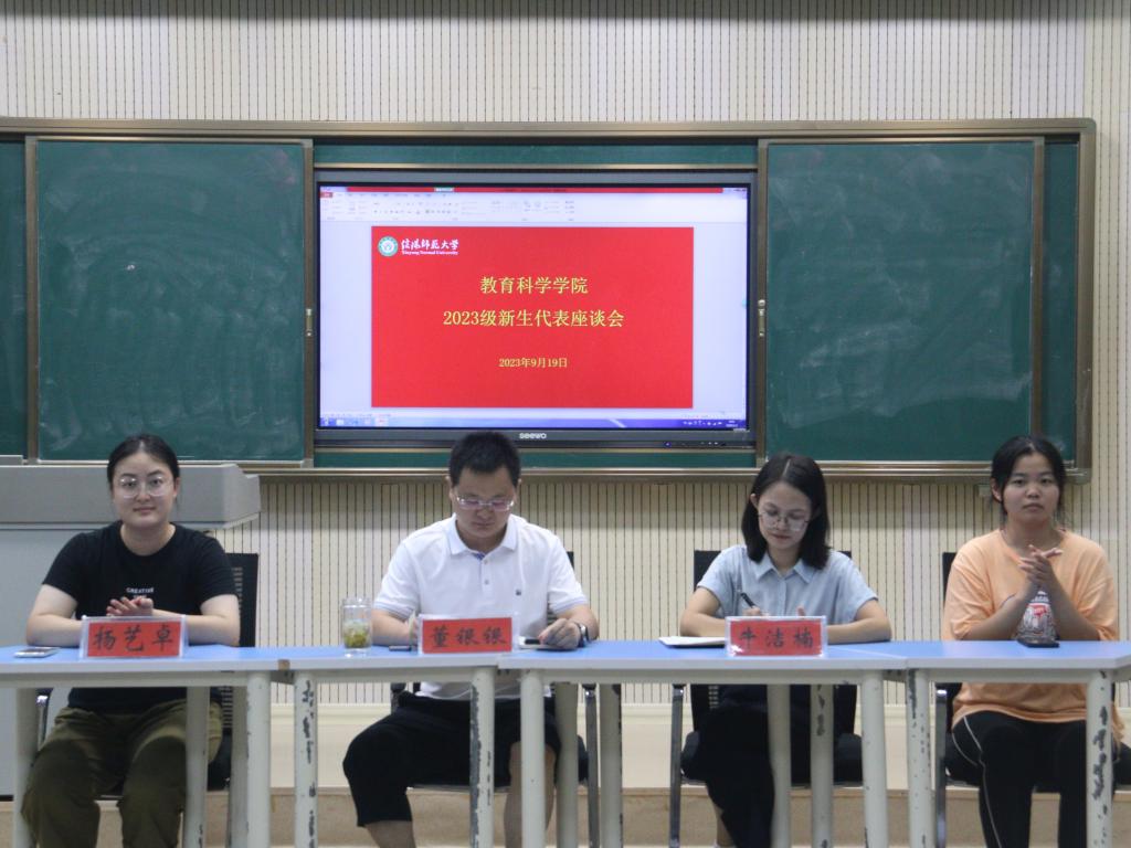 教育科学学院召开2023级新生代表座谈会时间:2023-09-20 16:27:03 来源:教科院新闻宣传中心 作者:荆媛媛 阅读: 次9月19日,教育科学学院于教科楼205召开2023级新生代表座谈会。教育科学学院党委副书记董银银,分团委书记牛洁楠,专职辅导员杨艺卓,学生会执行副主席刘瑞杰及40名新生代表参加本次会议。  会议伊始,董银银首先对新生代表表示了热烈欢迎,他希望同学们能够把握机会,积极参加学生会锻炼自己,做好学业生涯规划,珍惜时光,在大学这个舞台上,尽情展现自己,实现人生的价值。 会上,同学们逐一分享了自己的成长经历、报读学校的缘由和初入校园的体验,并代表班级同学就军训、学习和生活方面提出了一些看法和疑惑,充满期待地畅想了未来的大学生活,现场气氛欢快热烈。参会领导认真倾听了每位新生代表的发言并就所反映问题结合学院的教育管理制度,分别从不同角度予以学生详细解答,有针对性地提出了很多建设性的意见。  此次座谈会搭建了学院和学生交流的平台,将有效推进学生们所关心的相关问题的解决,让同学们对大学的学习、生活有了更清晰的认识,更好地帮助新生顺利适应角色的转变。 编辑:荆媛媛 审核:杨艺卓 摄影:李亦萌